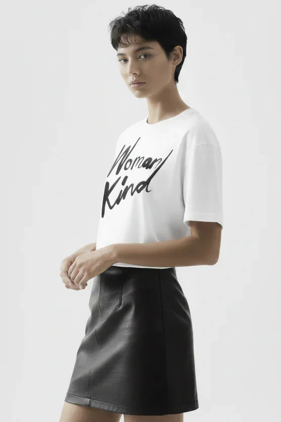 Wear your values. The Woman Kind-print reclaims language with a handwritten softness. A gentle feminist defiance in a cold world.